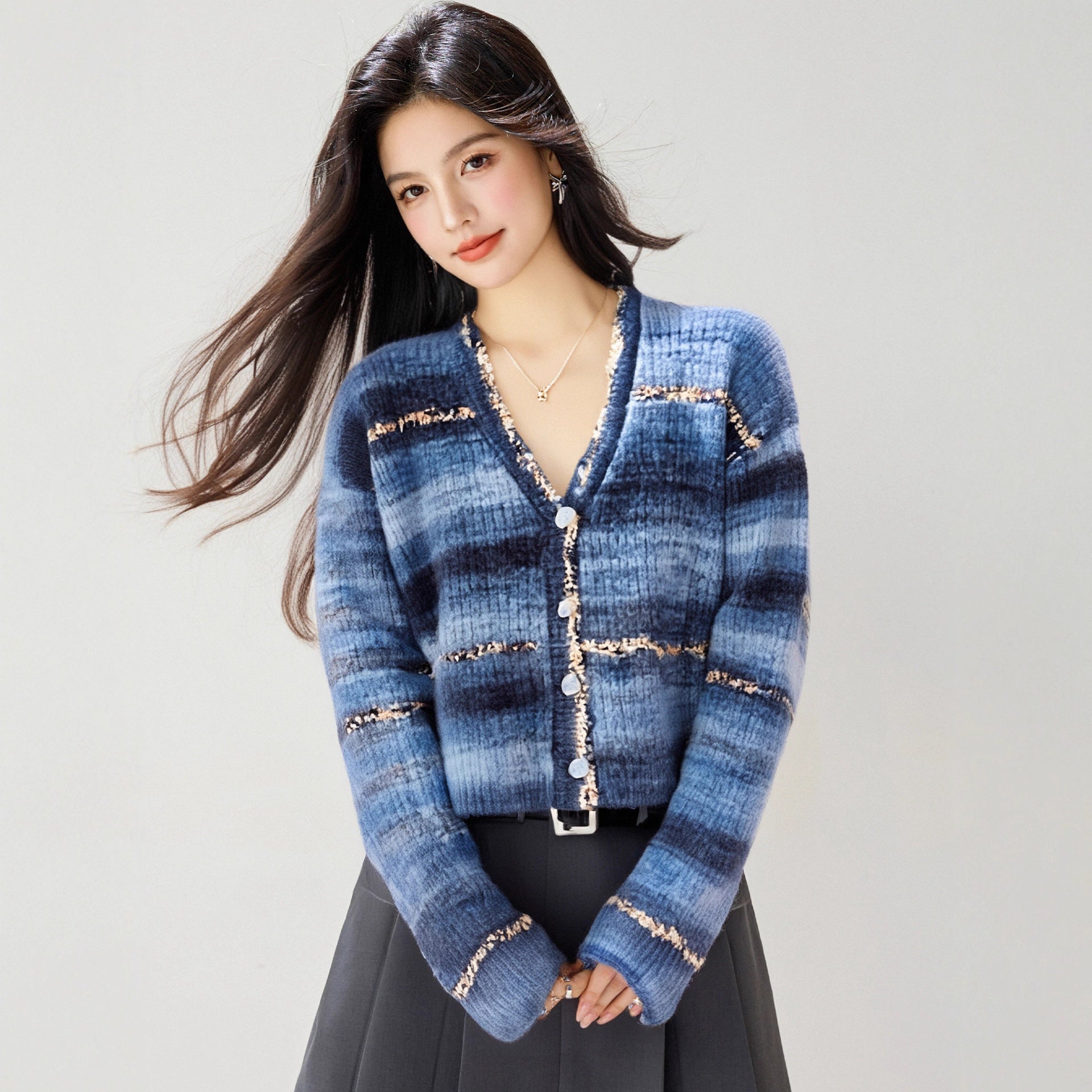French Style Chic V-Neck Long Sleeve Knit Cardigan for Women, Loose Slim Fit Single Buttoned Ruffle Collar Sweater